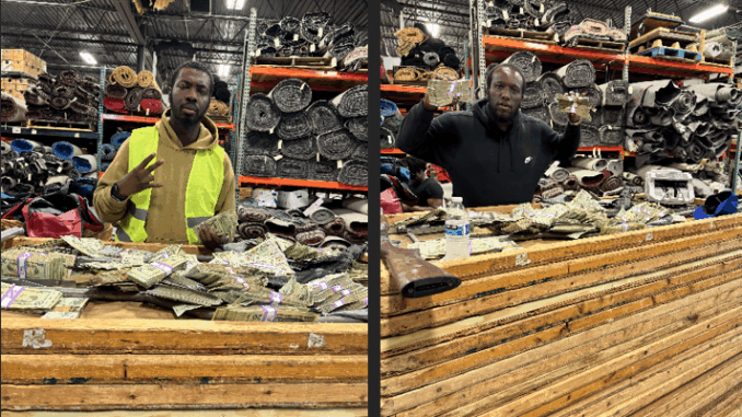 (Photo Courtesy of the Nassau DA’s Office) Dejuan Michaels (left) and Daiquan Smith (right) pose with the money, guns and watches worth approximately $1 million they stole from a Valley Stream home in 2023. They were both sentenced to nine years in prison.