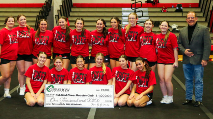 (Photo: Gershow Recycling) Jonathan Abrams (right) of Gershow Recycling is joined by members of the Patchogue-Medford High School cheerleading team, who are holding a check from Gershow Recycling in the amount of $1,000 on February 3. The money will be used to pay for the costs associated with the trip to the Universal Cheerleading Association National High School Cheerleading Championship, which will take place at Walt Disney World Resort in Orlando, Florida on February 6-8.