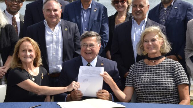Suffolk County Legislator Catherine Stark (R-Riverhead) hosted County Executive Ed Romaine on October 1 as he signed historic legislation creating Suffolk’s ‘Working Waterfronts’ program, joined by fellow East End Legislator Ann Welker (D-Southampton), other Suffolk lawmakers and key stakeholders from the county’s fishing, aquaculture, and related marine industries.