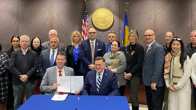 (Photo: Office of Legislator Chad Lennon) Suffolk County Legislator Chad Lennon (seated left) shakes hands with County Executive Ed Romaine after signing into law Lennon’s bill strengthening oversight of hotels and motels in Suffolk County to combat human trafficking at the William H. Rogers Legislative Building on February 2.