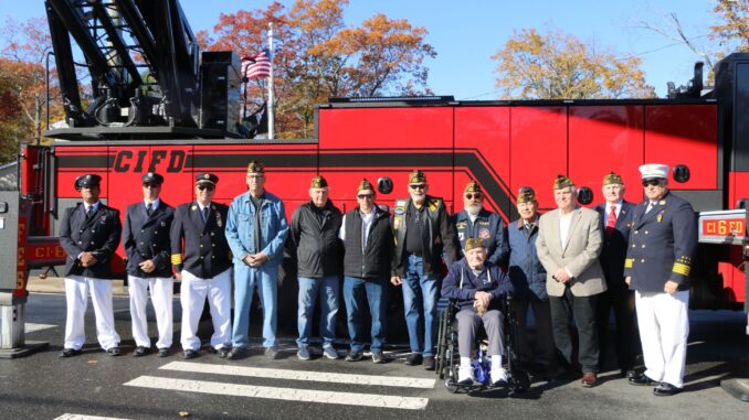 During its Veterans Day ceremony on November 8, Islandia Village Mayor Allan M. Dorman was joined by village officials and members of the Col. Francis S. Midura Veterans of Foreign Wars Post #12144 and the Central Islip Fire Department at the Veterans Memorial Triangle to honor those who served and continue to serve our country.