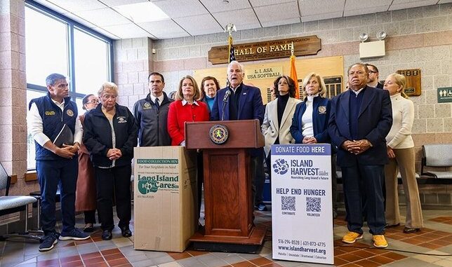Nassau County Executive Bruce Blakeman recently joined Long Island Cares CEO Katherine M. Fritz, Island Harvest CEO Randi Shubin Dresner, and other Nassau officials to declare a state of emergency and announce that the two organizations will be receiving additional emergency funding to combat food insecurity tied to the federal government shutdown.
