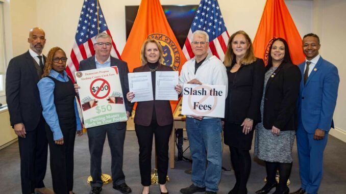 Nassau County Legislative Democrats, joined by local homeowners, held a press conference on February 18 to unveil legislation that would immediately reduce County Clerk filing fees. The Democrats called the fees excessive and the current structure an unlawful and unfair burden on homeowners that has left some residents paying more than $600 for routine paperwork.