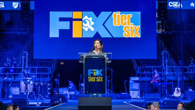 (Photo:Darren McGee/Office of Governor Kathy Hochul) Governor Kathy Hochul speaks at a Fix Tier 6 rally in Albany on March 8.