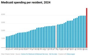 The state’s Medicaid enrollment is also unusually high. A 2024 analysis found that under-65 enrollment was more than twice the non-elderly population living under the income eligibility threshold (138 percent of the federal poverty level).