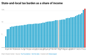 New Yorkers pay an average of 15.9 percent of their income in state and local taxes, the highest rate in the U.S. and 4.2 points higher than the national average, according to data gathered by the Tax Foundation.