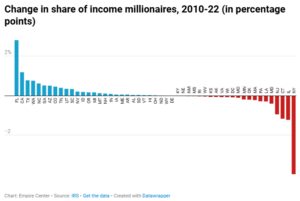 New York’s share of the income earned by millionaires has shown an even bigger 4.7-point drop, going from 14.6 percent in 2010 to 9.9 percent in 2022. That decrease was also by far the largest of any state’s.